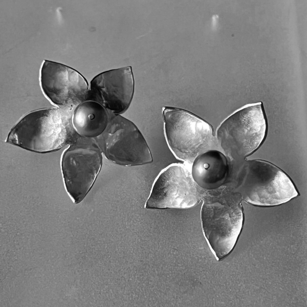 Zilveren met de hand gehamerde oor-bloemen die met een zilveren mechaniek aan het oorlelletje vast kunnen worden geschroefd. Gaatjes zijn niet nodig. Bedekken de hele oorlel