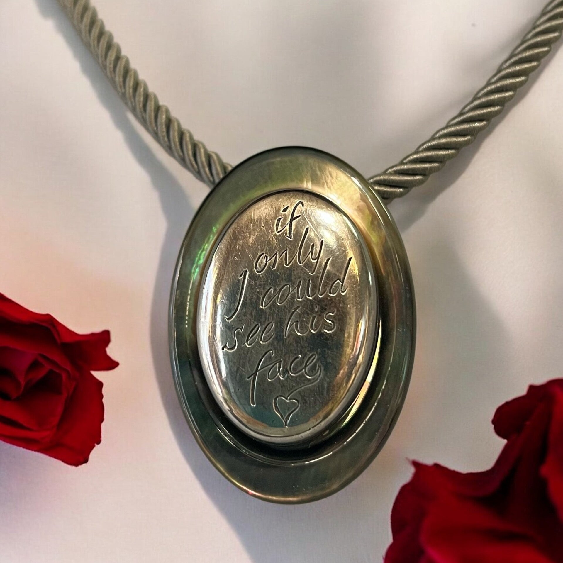 Ik heb twee medaillonnetjes. Eén is blanco met hals 2 mm, de ander is handgegraveerd met de tekst: 'If I could only see his face'; een tekst uit een Soefi gedicht. € 485,00 - unica