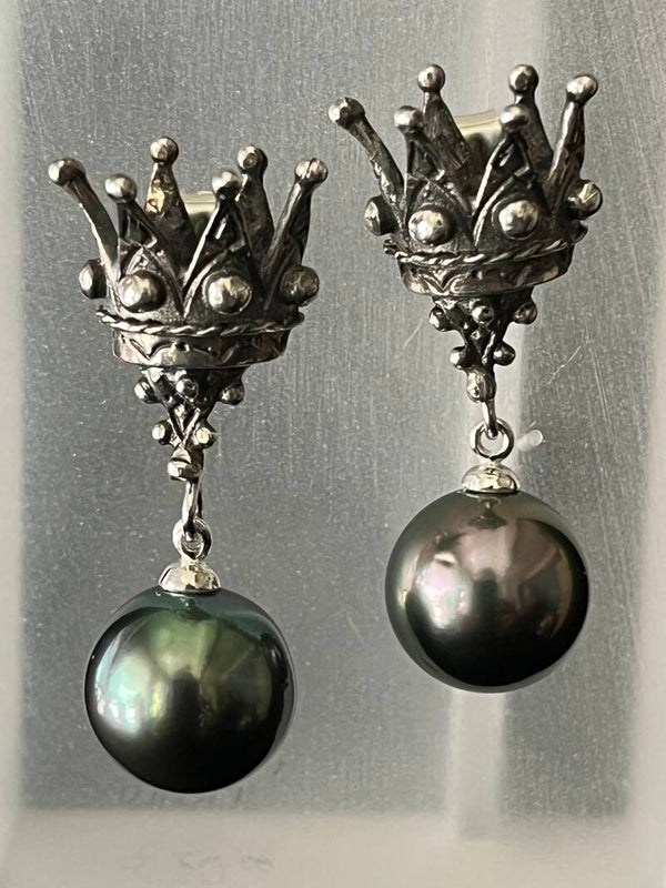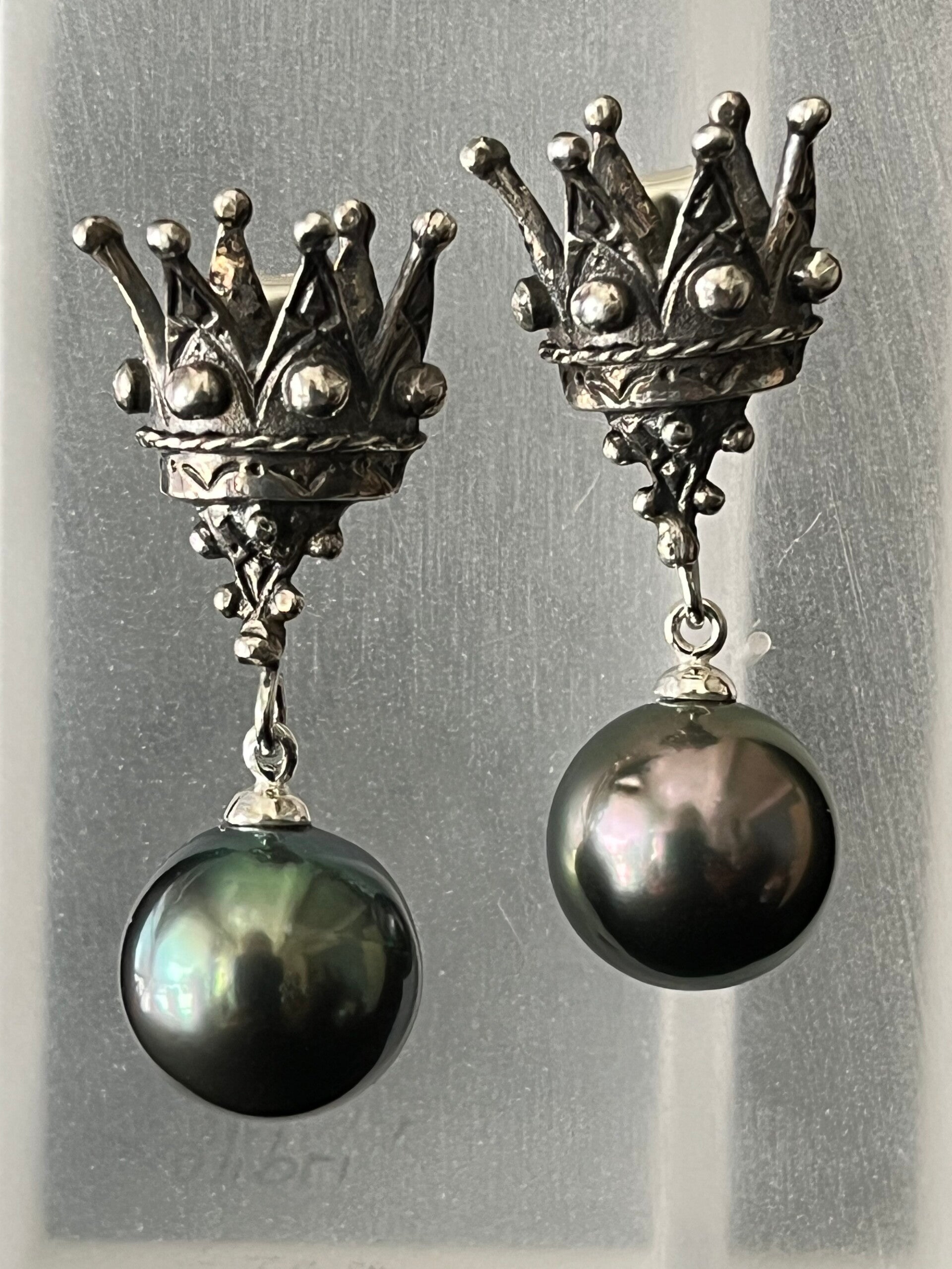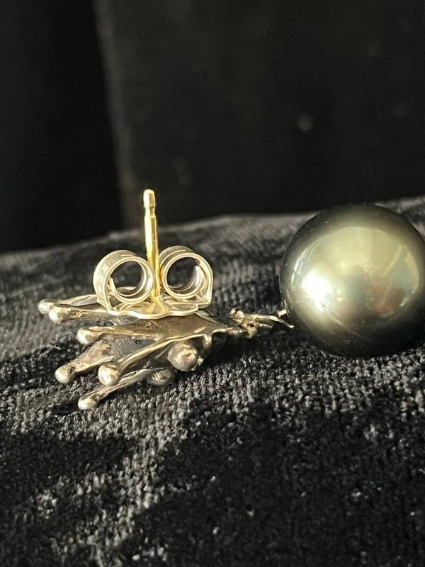 Dit zijn parels van formaat. Tahitiparels komen uit de Stille Zuidzee en elke parel is natuurlijk gekweekt en uniek, De ene parel heeft een iets paarsig luster, de ander is een fractie groener. De kroontjes zijn van zilver en hebben een 18 krt gouden steker met een grote bloem-poussette.