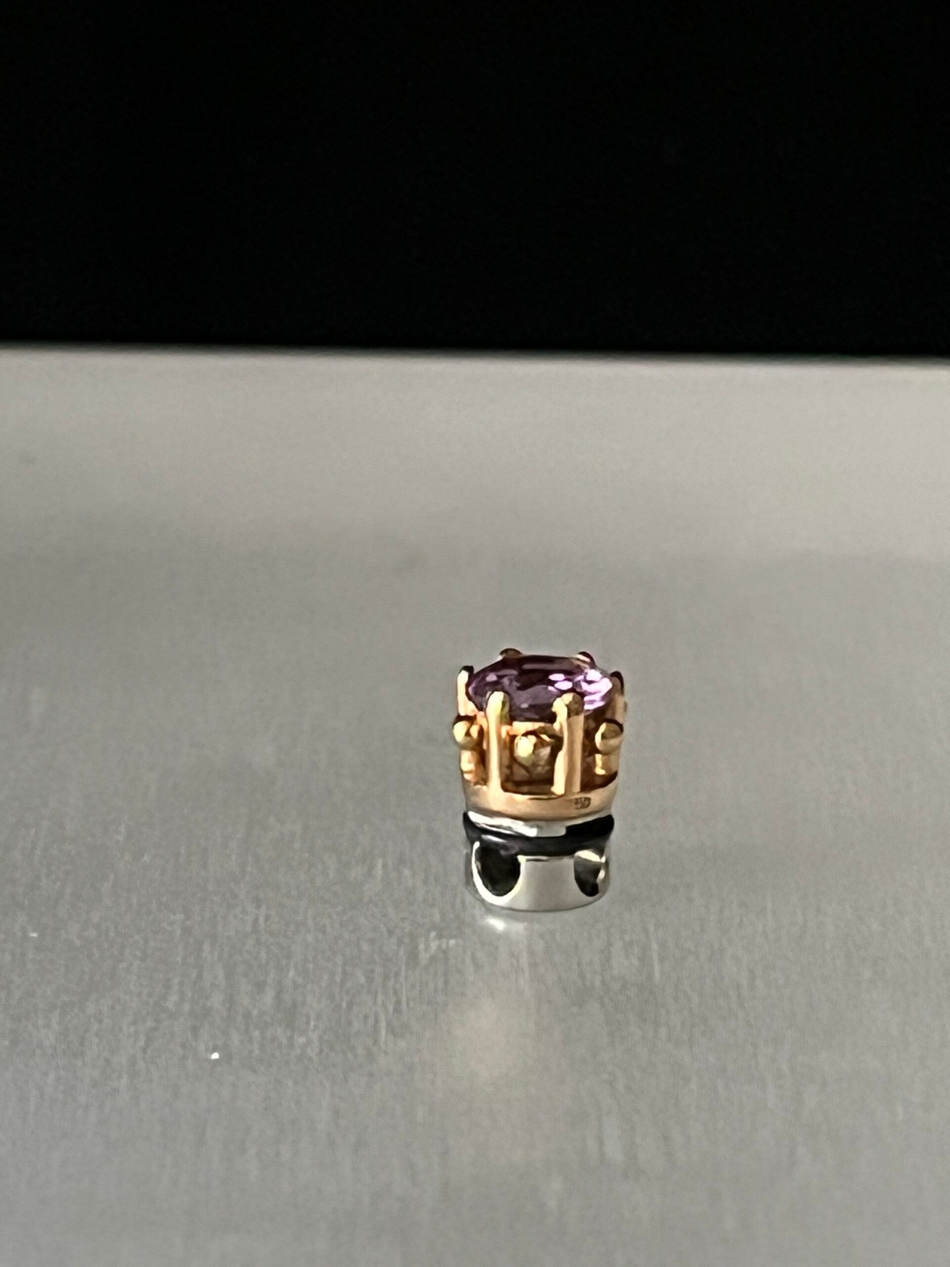 De heldere lichte amethyst heeft een briljant slijping en kleine granules aan de zijkant van de open rosé gouden zetting. Ze komt solo prachtig tot zijn recht, maar gecombineerd met fantasie schijven krijgt ze een spectaculaire uitstraling. Er zijn er zeer weinig van vervaardigd.