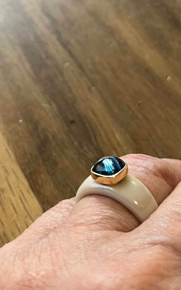 De topaas is diep van kleur, en erg mooi op eed zandkleurige keramische ring.