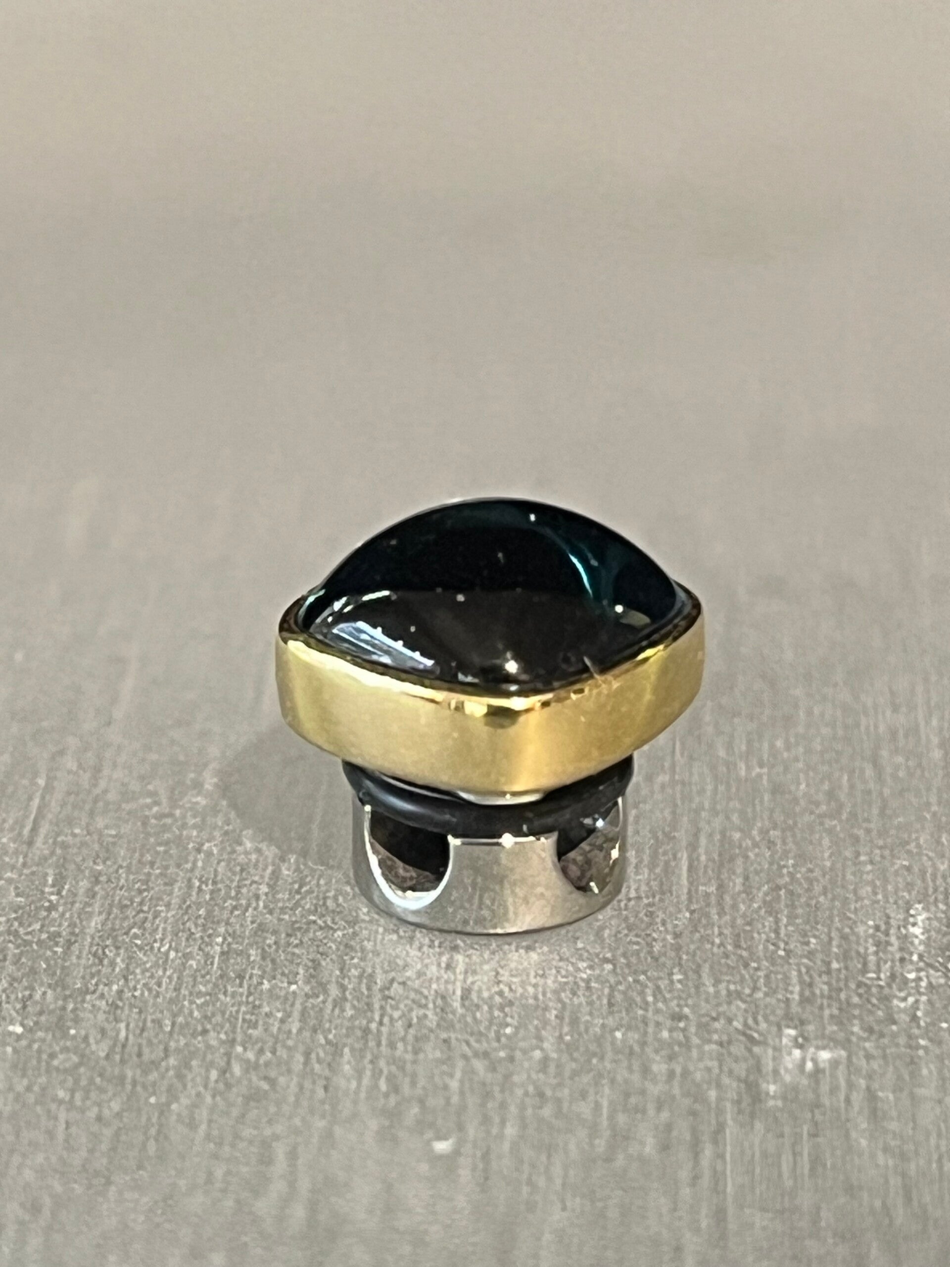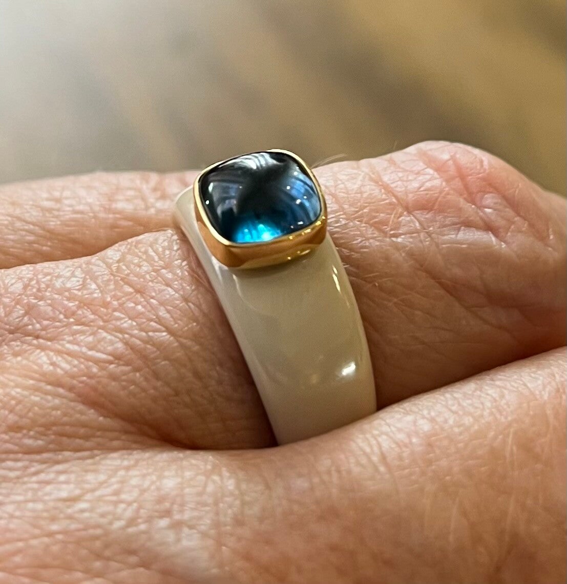 Deze bijzondere steen heb ik speciaal laten zetten door de goudsmeden van Ehinger Schwarz in geel goud. De afgeronde hoeken maken het ontwerp uitzonderlijk en geraffineerd.