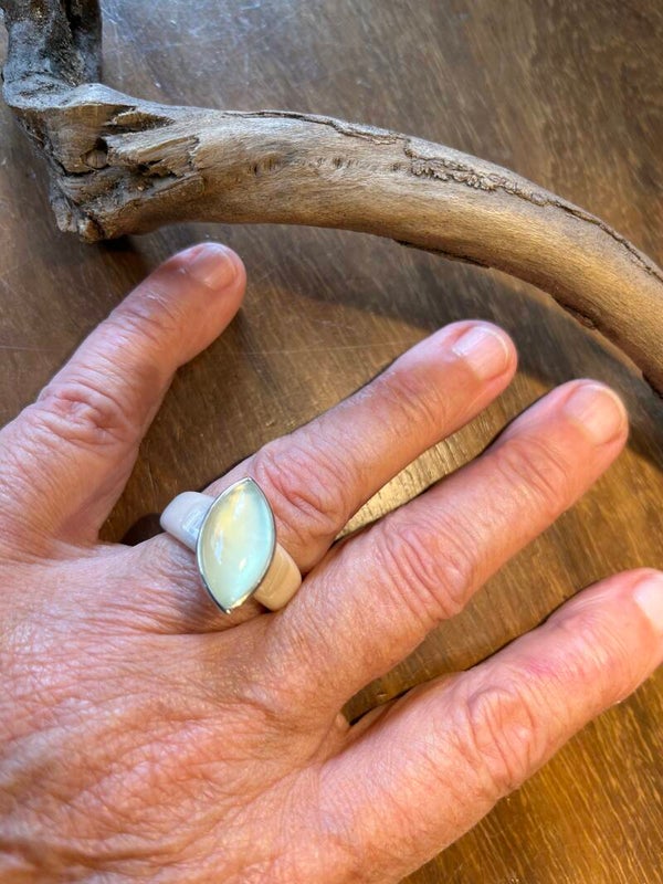 A-symmetrisch valt de markiesvormige steen in de ring, als een blaadje dat is neer-gedwarreld.
