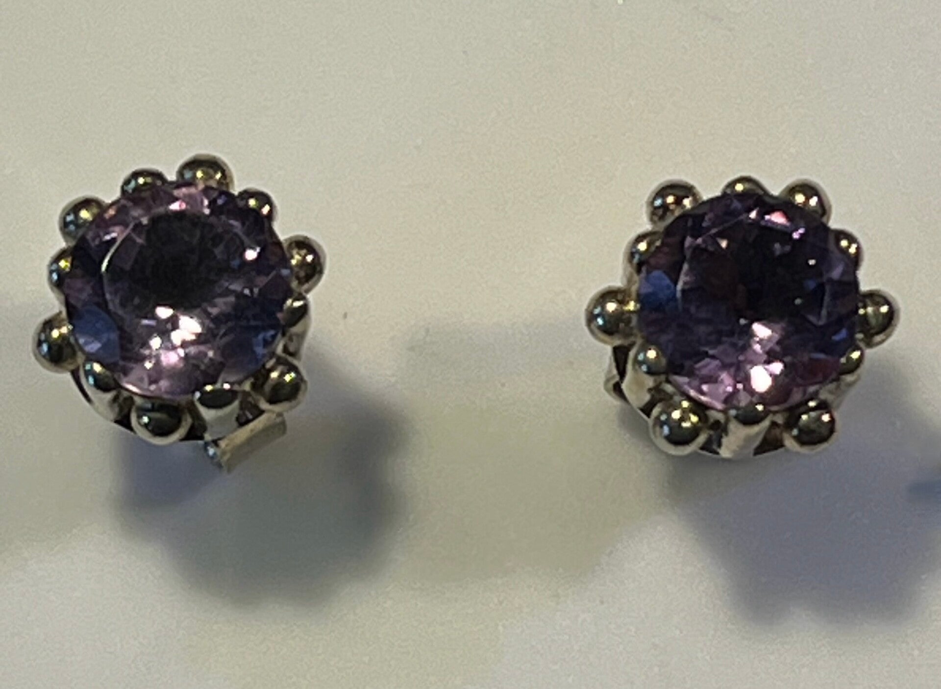 Fijne knopjes van zilver met mooie gefacetteerde amethyst. De steker zelf is van 18 krt goud.