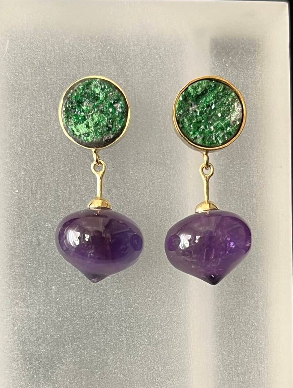 De tuin blijft een onuitputtelijke inspiratie. Groen met paarse en favoriete combi. De groen granaat kristallen heb ik gecombineerd met mooie, ui-vorige amethysten. Dit alles gevat in 18 krt goud; ik kan het niet laten.....