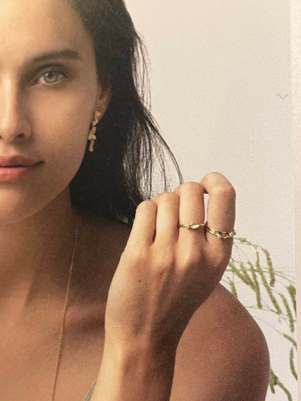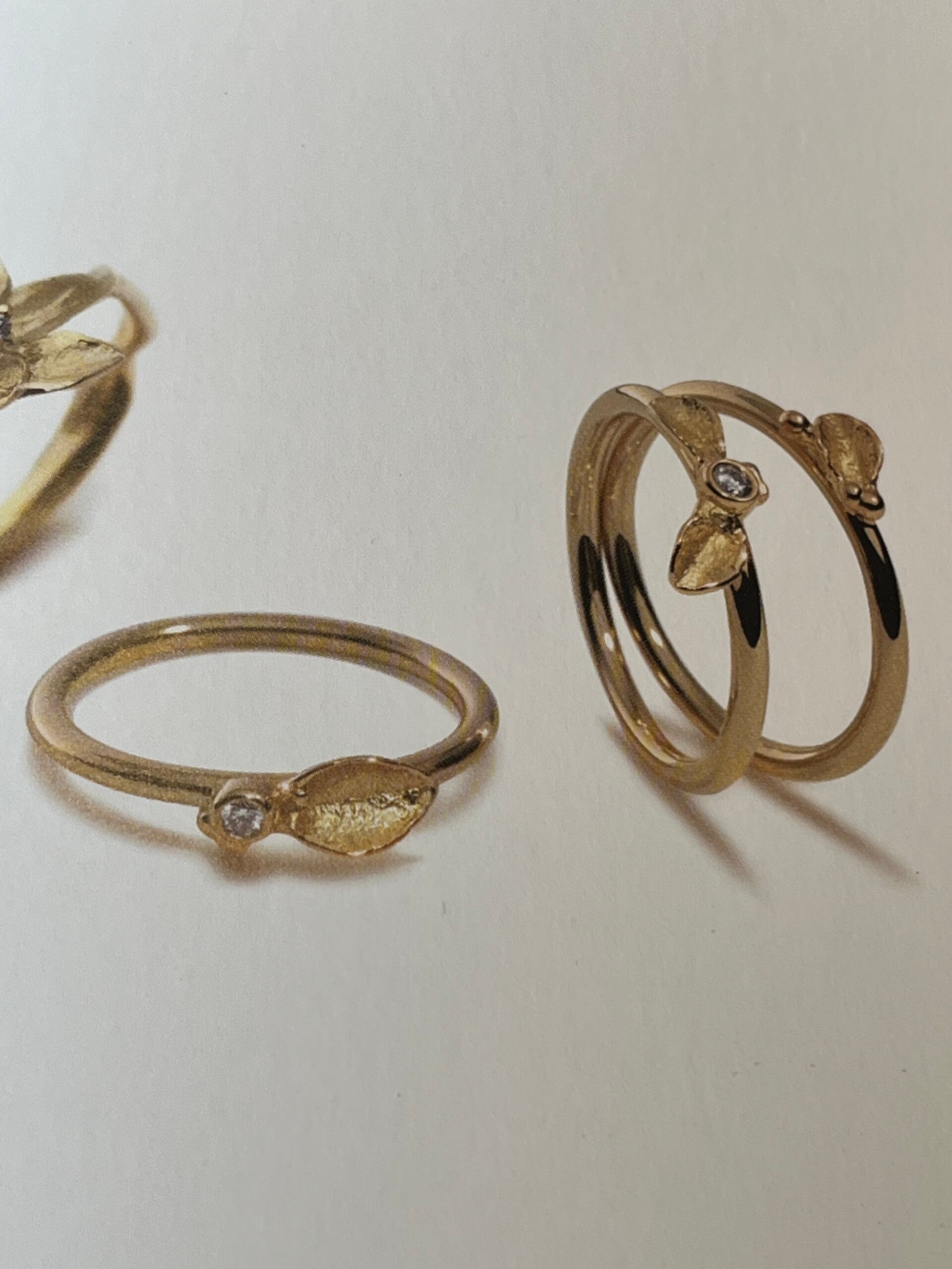 Als in de herfst de bomen de blaadjes in de wind bewegen, lijkt het alsof rood- en geel gouden kleuren een spel spelen. Het is als een dans. De aansluitende ringen waarvan één met diamant, zijn samen naast elkaar gedragen prachtig, maar ook solo heel mooi aan je vinger. Door de wisselende goud prijzen is de prijs op aanvraag. Vanaf € 860,00 voor de ring met één blad zonder diamant, onder voorbehoud van de dagprijs.