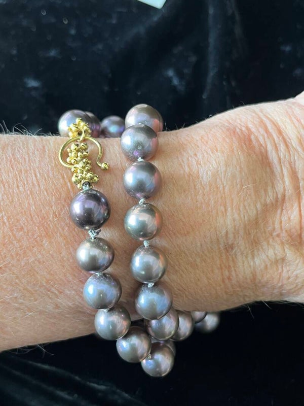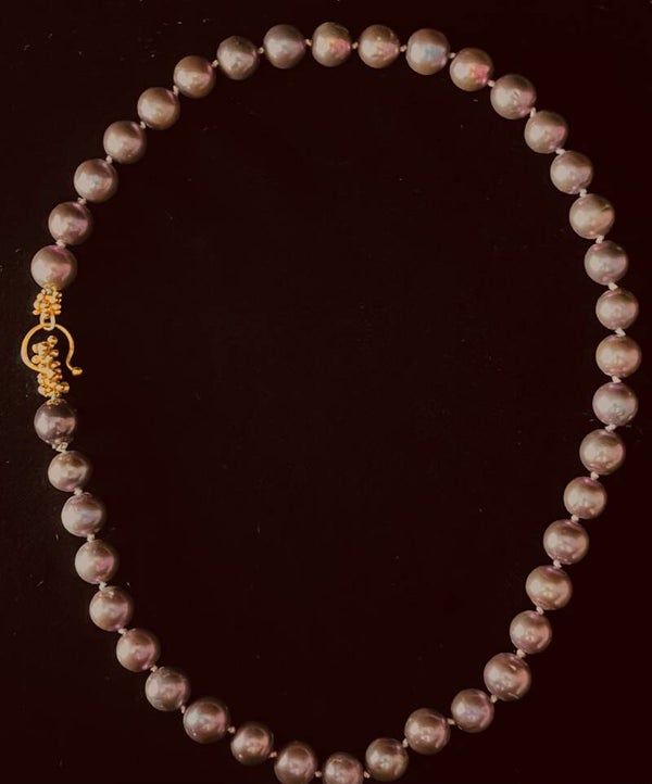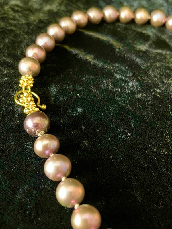 De kleur van deze zoetwaterparels is moeilijk te vangen in een foto. Het is een mix van paars en lila.